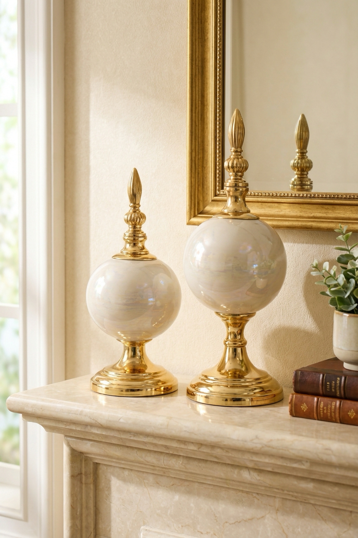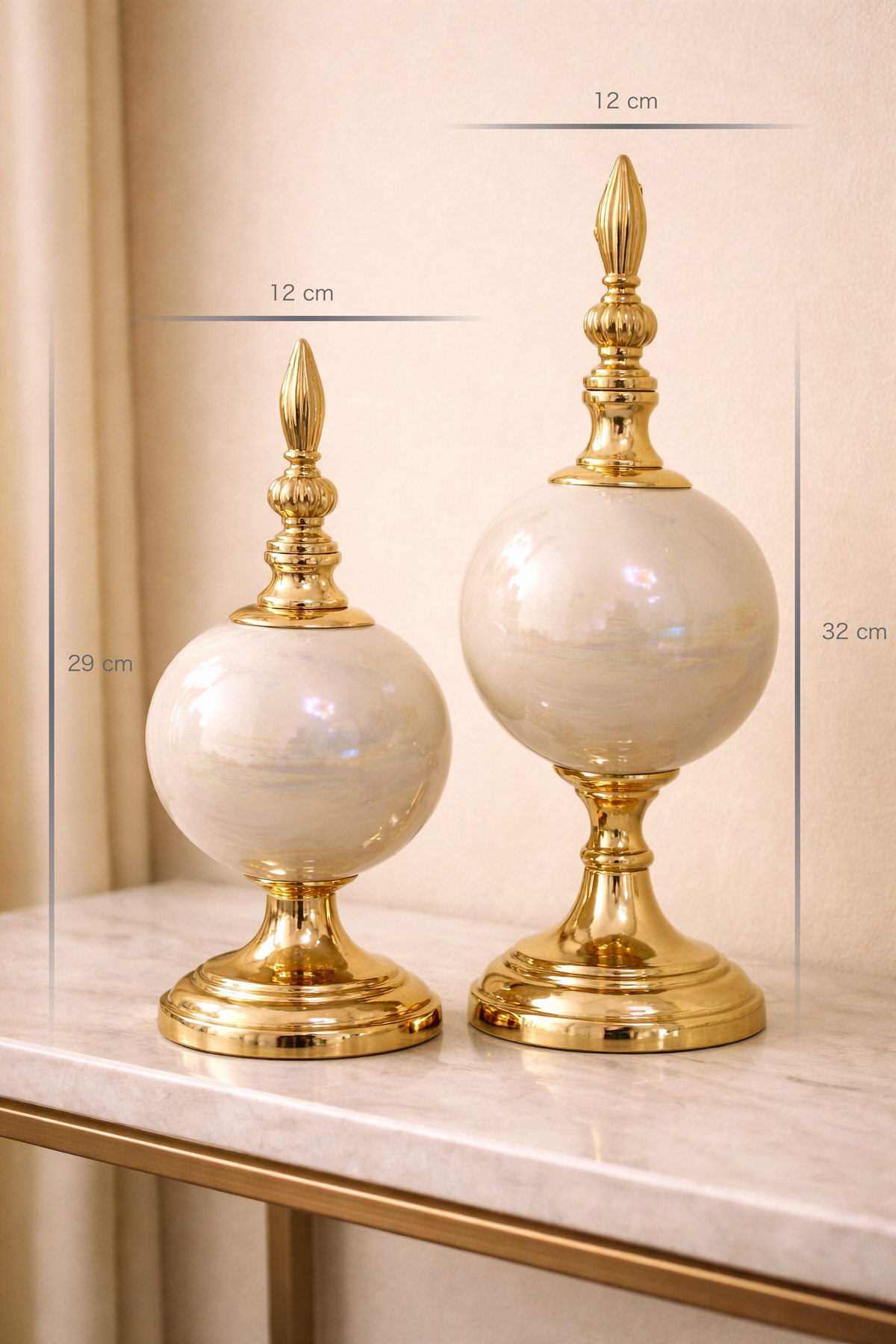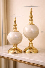 Her bir parça, ustalıkla şekillendirilmiş seramikten üretilmiş olup, pürüzsüz yüzeyi ve göz alıcı altın rengiyle lüks bir görünüm sunar. İkili tasarımı sayesinde ister yan yana, ister ayrı ayrı kullanarak mekanınıza farklı ambiyanslar katabilirsiniz. Salonunuzun konsolu, çalışma odanızın masası ya da yatak odanızın şifonyeri üzerinde, bu aksesuarlar bakışları üzerine çekecek ve dekorasyonunuzun odak noktası haline gelecektir.